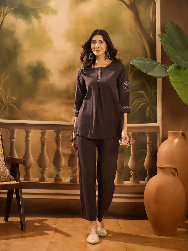 Brown Round Neck Pure Cotton Solid Co-ords Set for Women